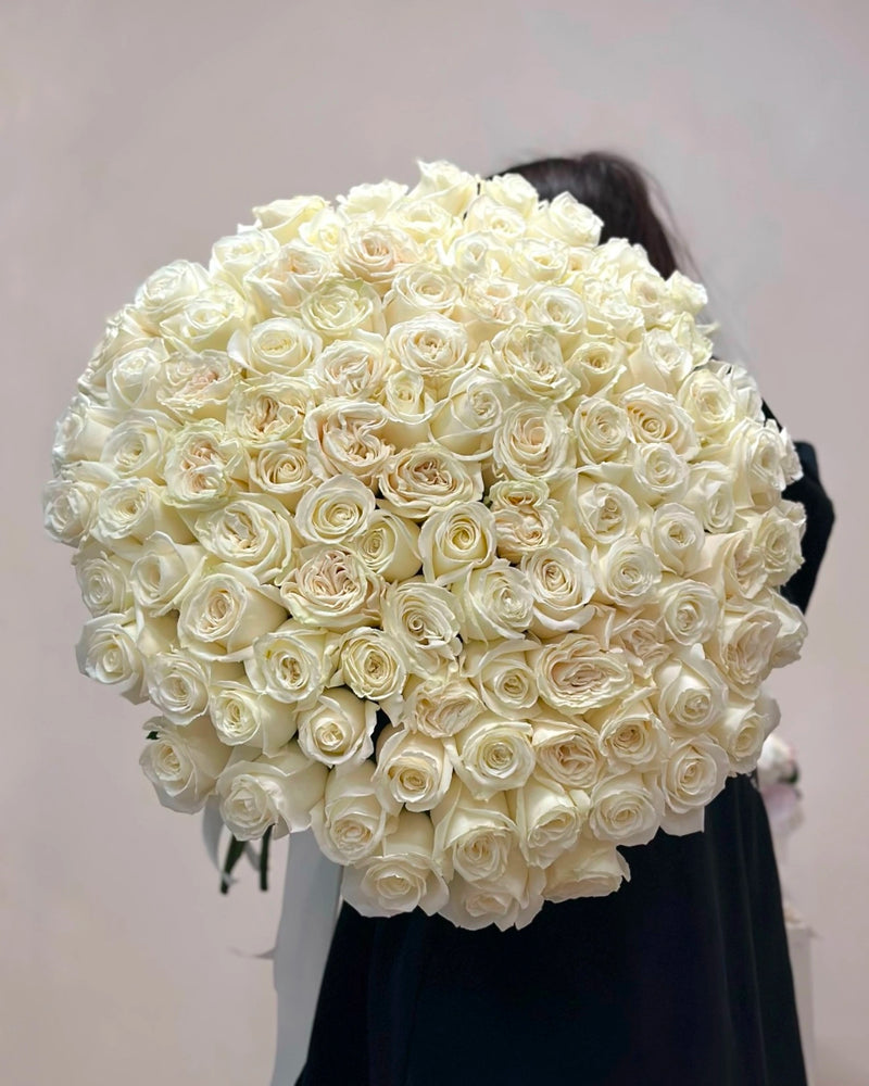 These pristine white roses symbolize loyalty, sincerity, and timeless love, creating a beautifully serene aesthetic. Each stem is carefully arranged to achieve a clean, airy composition inspired by French garden simplicity.